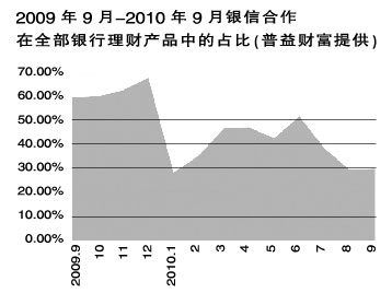 普益財(cái)富數(shù)據(jù)顯示,8月份銀信合作產(chǎn)品發(fā)行298款,較7月份下降26.42%,信貸類理財(cái)產(chǎn)品僅發(fā)行21款,在銀信合作產(chǎn)品中占比不足一成,其中,包括信貸資產(chǎn)投資類產(chǎn)品13款,信托貸款類產(chǎn)品8款;9月份,銀信合作產(chǎn)品發(fā)行307款,信貸類產(chǎn)品同樣發(fā)行21款,而純信托貸款類產(chǎn)品則絕跡于理財(cái)產(chǎn)品行列。