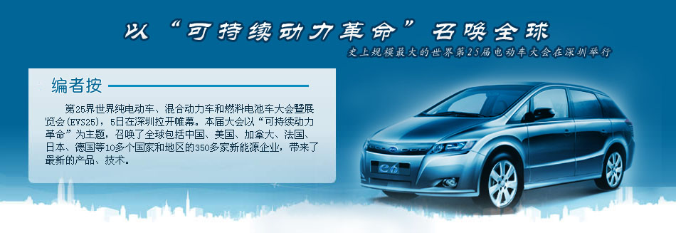 | 在第25屆世界純電動(dòng)車、混合動(dòng)力車和燃料電池車大會(huì)暨展覽會(huì)(EVS25)上,比亞迪新能源汽車三劍客——F3DM雙模電動(dòng)車、e6純電動(dòng)轎車、K9純電動(dòng)大巴亮相。其中電動(dòng)大巴K9自9月底下線后,首次亮相于公眾。[詳細(xì)] |