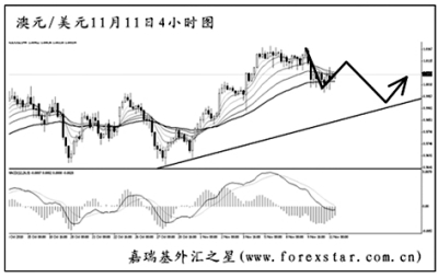 ▲澳元兌美元在突破平價水平之后的運行幅度有限,目前匯價小幅下調(diào),但仍保持在1.0000上方。圖中上升趨勢線為日線圖形成,斜率陡峭,澳元將首先挑戰(zhàn)此位。中線的道氏理論顯著低點在0.9650附近,澳元若想結(jié)束其跌勢還將會經(jīng)歷很大的一段考驗。