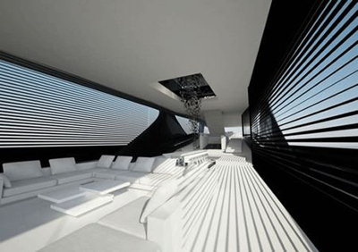 spa,全世界最高級(jí)的健身房,電影院當(dāng)然也是必不可少的。Beluga的主甲板前面有一個(gè)14米長(zhǎng)的游泳池,并且在兩個(gè)平行的休閑區(qū)還設(shè)有雞尾酒吧。車庫(kù)可以容納兩輛普通房車,在空置時(shí)可以很輕松的變成一家夜總會(huì),舞池和高檔音響肯定是必備的。