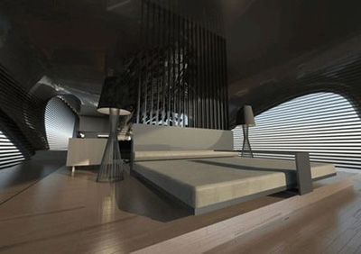 這是一個(gè)非常高端的設(shè)計(jì),堪稱經(jīng)典之作,兩個(gè)獨(dú)立生活區(qū)通過(guò)一個(gè)玻璃樓梯間進(jìn)行連接,船上有whisky(威士忌)酒吧、圖書館,還有一個(gè)種有棕櫚樹和小型菜園的綠色花園,其天窗打開時(shí)形狀就像鯨魚的嘴。