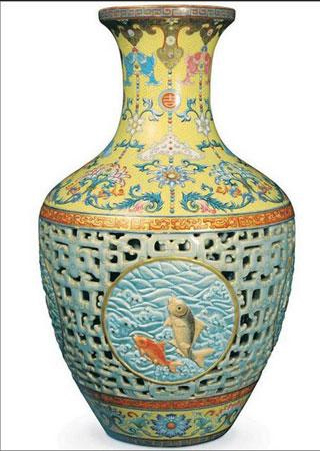 該瓷瓶是海倫·波特的父母在1930年代得到的,并一直保留至今。海倫·波特兄妹倆在收拾已故父母的舊宅時發(fā)現(xiàn)這個瓷瓶,據(jù)說在家中收藏了約70年。專家認(rèn)為,這個瓷瓶是乾隆三十多年官窯制品,并應(yīng)該是皇宮收藏。瓶高約40厘米,瓶底印有“大清乾隆年制”的字樣,瓶身鏤空,中間繪有兩條魚和紋形波浪,瓶頸涂黃色,瓶身天藍(lán)色,是清朝乾隆時期的粉彩鏤空瓷瓶。