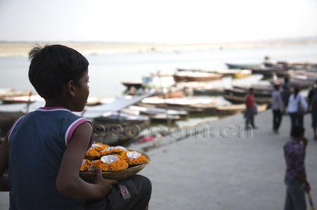 點(diǎn)兩塊碎蠟,焚幾柱印度香,面朝恒河,閉目而坐,念念有詞,發(fā)型奇異、身穿橙色衣衫的苦行僧在岸邊的高臺(tái)上擺開架勢(shì),冥想、修煉;瓦臘納西是印度7種宗教的圣城,而恒河又是這圣中之圣,沿岸六十多個(gè)Ghat石階上,不同信仰的男女在喧鬧的人群中置身事外地閉目禱告;身穿艷麗紗麗的女人們用飾品將自己從頭到腳裝飾起來,在河中放下鮮花做成的河燈、花環(huán)、鮮果,為自己和親朋祈福;乞丐們喜歡坐成一長排,向路人和游客伸手,他們每人都有兩個(gè)碗,一個(gè)裝錢,一個(gè)裝糧食,因?yàn)楫?dāng)?shù)厝送鶗?huì)給他們一些米或豆子;在河邊洗滌的人們把衣服、床單、桌布花花綠綠在河邊的草地和臺(tái)階上鋪展開來,好似一幅幅絢爛的抽象畫。臨走之時(shí),所有印度人都會(huì)裝一壺恒河的圣水,或回家飲用,或送進(jìn)神廟。