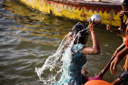 清晨和夜晚是恒河最迷人的光景,也是最熱鬧的時(shí)刻。趕在太陽升起之前租一條木船,在濃霧籠罩的河面泛舟,有種置身仙境的神秘。太陽慢慢升起來,紅彤彤地望著古老的恒河,給原本灰黃的水面鍍上了一層柔和的金紅,好似裝飾精美的紗麗。河岸上開始喧鬧起來,來自印度各地的善男信女,提著水壺、帶著祭品、扶老攜幼地從一個(gè)個(gè)蜿蜒曲折的小巷中擠出,邁下一級(jí)級(jí)厚實(shí)的石階,繁星般在瓦納那西綿延6.7公里的河岸邊散布開來,開始一天中最隆重的儀式——恒河晨浴。他們緩緩步入圣河,祈禱、懺悔、沐浴、飲水,向神靈傾吐心內(nèi)的苦悶和喜悅,用恒河的圣水洗去今生的罪孽,祈求來世的福佑。