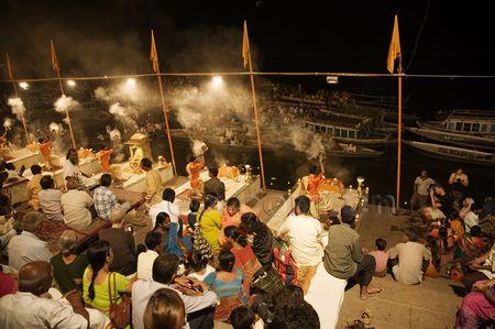 夜幕初降,坐在餐廳臨河的陽臺(tái)上晚餐,“ganga……(印度語,恒河)”河面飄來悠遠(yuǎn)、蒼涼的歌聲,仿佛從遠(yuǎn)古而來。循聲望去,主碼頭上一片燈火輝煌、人聲鼎沸,隆重的晚祭開始了。河岸廣場上搭起一個(gè)個(gè)寬闊的木板,上面放著鮮花、香爐、神像、經(jīng)書等祭祀用品,一群衣著光鮮、考究的婆羅門青年站在祭臺(tái)前神情肅穆地焚香、唱經(jīng)、祭祀。臺(tái)下是人山人海的信眾,用擊誦經(jīng)與祭祀們應(yīng)和。滿載游客的船只也聚集到祭臺(tái)周圍的河面,鎂光燈在夜空中閃個(gè)不停。除了停電或惡劣天氣,恒河邊每天都有晚祭。祭祀結(jié)束后,信眾們也久久不愿離去,繼續(xù)在河邊祈禱、乘涼、玩耍,直到深夜十一二點(diǎn)?傻诙烨宄克奈妩c(diǎn)鐘,恒河邊又熱鬧非凡了。對(duì)印度來說,時(shí)間最應(yīng)該用來親近恒河,睡覺實(shí)在太浪費(fèi)光陰了。