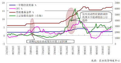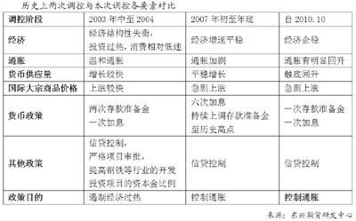 綜合以上分析,我們認為,近期貨幣政策收緊的目的很明確,那就是遏制通脹,而不是通過給經濟降溫抑制社會總需求。實際上一次性的上調存款準備金以及加息對流動性“抽血”效應并不顯著,市場近期作出較大反應主要是因為對于央行連續(xù)加息的預期。因為如果加息周期出現(xiàn),將會給股市和商品帶來流動性收縮后的短期資產價格重估,也會在一定程度上抑制投資需求和消費需求。只要國家不出臺限制社會總需求的政策,股市和商品都將迎來中長期上漲行情,可逢低建立中長線多單。歷史數(shù)據顯示,僅僅是收縮流動性的政策并不會使股市和商品陷入明顯回調,每一輪流動性緊縮也都伴隨著股指和商品的上升周期。