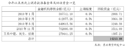 近期國內金融市場異動,股票市場和期貨市場都出現(xiàn)大幅度回調,這一切均發(fā)生在中國人民銀行于11月10日宣布上調存款準備金之后,而此前央行剛剛進行了兩年來的首次加息。根據每次上調準備金率前一個月的金融機構存款余額測算,五次上調準備金率共從銀行體系中回收逾1.42萬億元的流動性,單單最近一次上調準備金率就抽走超過3500億元資金。