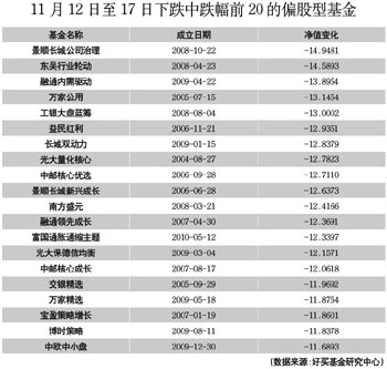 從具體的基金來看,本輪12日至17日跌幅居前20的偏股型基金中,景順長城公司治理、東吳行業(yè)輪動、融通內(nèi)需驅(qū)動、萬家公用分別以-14.9481%、-14.5893%、-13.8954%、-13.1454%位居跌幅前四位。