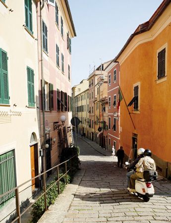 利古里亞(Liguria)是意大利行政大區(qū)中面積最小的一個(gè),它形如一條長(zhǎng)帶,西接法國(guó),南接托斯卡納大區(qū),背靠阿爾卑斯和亞平寧山脈,面對(duì)利古里亞海。這里幾乎沒(méi)有什么平地,連綿陡峭的懸崖直插大海,形成曲折的海岸線,許多小城悄然隱藏于山海之間。遠(yuǎn)遠(yuǎn)看去,房屋就像是從峭壁上長(zhǎng)出來(lái)的尖蘑菇一樣。窗戶下面就是海水,手里掉下一個(gè)蘋(píng)果,就“撲通”一聲掉進(jìn)海里。