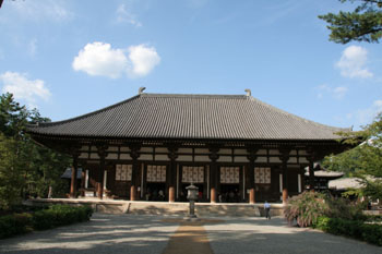 奈良最著名的大寺要屬東大寺,這里還是鑒真大師東渡后為圣武太上皇、光明太上皇后、孝謙天皇受戒之地。而東大寺最享有盛名的建筑要數(shù)大佛殿,殿內的盧舍那佛像是日本最大的銅佛,高近15米。當年為給大佛鍍金共使用了約375公斤黃金和2110公斤水銀。不過,如今的大佛殿和大佛都是江戶時代重建的,大殿體積只相當于當年體積的2/3。盡管如此,在奈良西郊當年的皇宮正殿,也能夠清楚地看到東大寺大佛殿巨大的屋頂,大佛殿在近代以前一直是世界最高大的木造建筑物。