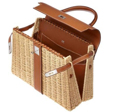 這款“鄉(xiāng)村凱莉包”(Country Kelly)是兩種傳統(tǒng)技藝結(jié)合的產(chǎn)物:籃子編制和皮革制作,優(yōu)雅簡(jiǎn)潔,出人意料。兩個(gè)藤條外殼通過人字呢系帶與Barenia小牛皮部件—內(nèi)口袋、袋蓋和挎帶—相連,保證了皮包結(jié)構(gòu)穩(wěn)固、便于握持?胺Q一款真正的野餐小竹籃。