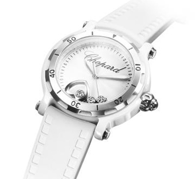 版本的快樂心腕表。白色橡膠表帶飾有象征愛情的符號(hào),三顆鉆石在表盤上不停轉(zhuǎn)動(dòng),其中一顆更被溫柔地抱緊于白金心形的懷抱當(dāng)中。以一種浪漫而微妙的方式展示著愛與被愛。