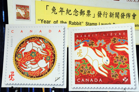 加拿大郵政總局宣布將在2011年1月7日發(fā)行兔年生肖郵票,以慶祝中國農(nóng)歷辛卯兔年,這是加拿大新一輪生肖系列郵票中的第三套,分為國內(nèi)版和國際版。這款兔年生肖郵票樣本日前在溫哥華亮相,左為國際版,右為國內(nèi)版。
