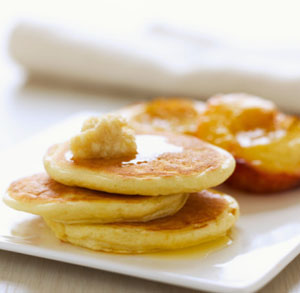 2.把不粘鍋用慢火加熱,一小勺黃油在鍋上融化攤勻,將拌好的面糊放一勺在鍋上,攤成荷包蛋大小,煎1分半鐘,將美國切達(dá)奶酪切絲放在面餅上,再加少許面糊,翻個(gè)面再煎1分半鐘,食用時(shí)拌糖粉少許即可。