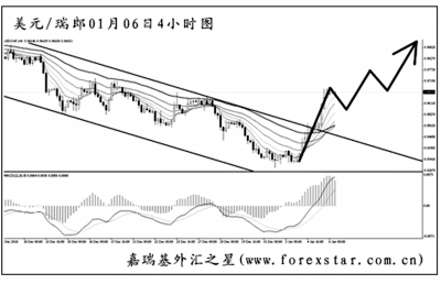 ▲美元兌瑞郎在創(chuàng)出日線圖新低之后強(qiáng)力反彈上行,已經(jīng)將下降通道的上沿大幅升破。日線收出兩根實(shí)體大陽線,即將考驗(yàn)均線系統(tǒng)的壓制位。圖中顯示匯價(jià)上漲的斜率陡峭,MACD多頭動(dòng)能十分充盈,目前正在考驗(yàn)0.9665的道氏理論阻力,升破后將展開更為迅猛的上沖走勢(shì)。