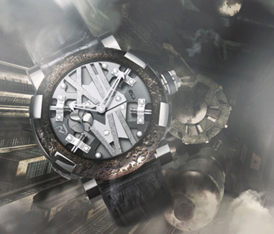 為了更好的滲透STEAMPUNK蒸汽朋克腕表的設(shè)計(jì)靈感,同樣的原始色調(diào)也被運(yùn)用于羅馬數(shù)字XII與VI。這些有力的美學(xué)代碼通過(guò)布里奇緞磨砂或圓形顆粒飾紋注入活力,這些都是由RJ-Romain