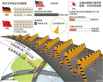 “中國高速公路通行費(fèi)和國際相比偏高。”世界銀行在2007年的一份報(bào)告中認(rèn)定。受高通行費(fèi)的影響,中國成為了全球物流成本最高的國家之一。據(jù)統(tǒng)計(jì),在中國,全社會(huì)物流總成本占GDP比重的21.3%左右,而發(fā)達(dá)國家則是10%左右。與我國幾乎全部收費(fèi)的7.4萬公里高速公路不同,2003年美國高速公路總里程為9萬多公里,其中收費(fèi)里程僅為7800多公里,約占8.8%。