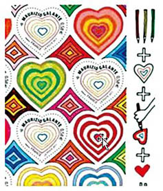 其中面值0.58歐元的郵票是自由上色郵票(圖1),主圖是5層心形,使用者可以根據(jù)自己的喜好給各層心形涂色,郵票左下的小圖案就是使用說(shuō)明;面值0.95歐元的郵票上有一顆大紅心(圖2),這顆紅心是采用燙印技術(shù)印上的一層可以刮掉的膜,使用者可以用筆在上面刮劃出自己的名字或想說(shuō)的簡(jiǎn)短話語(yǔ),左下小圖說(shuō)明中紅心上的MG就是設(shè)計(jì)師姓名的縮寫。