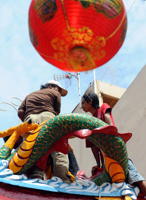 1月26日,在印度尼西亞首都雅加達,兩名印尼工人在班芝蘭區(qū)華人寺廟“清元宮”修葺屋頂?shù)凝埿蔚袼堋?BR> 隨著春節(jié)的臨近,班芝蘭唐人街附近的華人寺廟加緊修葺,一些購物場所掛滿中式燈籠,印度尼西亞郵政還發(fā)行了以中國農(nóng)歷生肖“兔”為主題的郵票,整個雅加達洋溢著過年的氣氛。印尼是全世界海外華人最多的國家,華人總數(shù)超過1800萬,其中又以首都雅加達華人聚居最多。