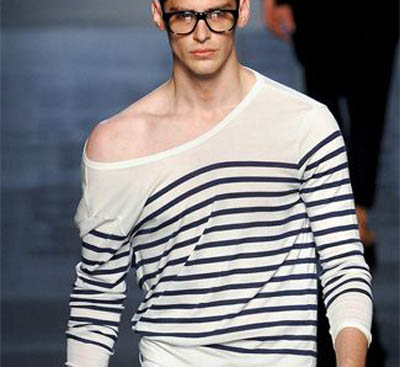 Gaultier依舊將喜歡的海軍藍(lán)條紋衫置于2011年春夏新系列中,在T臺(tái)上與白色長褲、白色尖頭皮鞋搭配在一起,一派摩登好少年模樣;同樣是條紋衫+白褲、白鞋,Junya