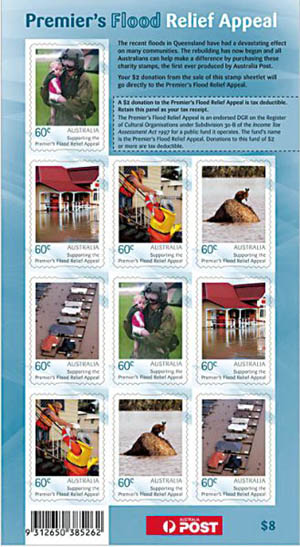 對(duì)災(zāi)區(qū)的重建已經(jīng)開(kāi)始。為了讓所有的澳大利亞人有機(jī)會(huì)參與賑災(zāi),籌集資金,昆士蘭州州長(zhǎng)安娜·布萊和澳大利亞郵政總裁兼首席執(zhí)行官艾哈邁德·法奧1月25日在布里斯班會(huì)展中心宣布,將發(fā)行澳大利亞郵政歷史上的第一種慈善郵票。郵票以小版張的形式發(fā)行,每個(gè)小版張含5種圖案的郵票各2枚。郵票面值沒(méi)有采用通常附捐郵票面值“郵資+附捐”的形式,為60澳分,但在小版張右下角印有售價(jià)8澳元。換句話說(shuō),購(gòu)買每一個(gè)小版張,等同捐款2澳元。小版張上方用虛線圍起的部分,是捐款的收據(jù),年底申報(bào)個(gè)人所得稅時(shí)可用于抵扣應(yīng)稅額度。