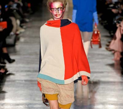 雖然只是Vivienne Westwood的一個副牌,但是“西太后”仍是愛將自己不變的“瘋癲”精神嚴格照搬。模特的主打妝容是扭曲的“傷痕妝”,五顏六色的彩妝打造出調(diào)色板一樣的臉龐,頭頂標志性大號“皇冠”。更有黑人模特將金粉完全鋪散在臉上,就連雙眼也用墨鏡擋住。五顏六色就是Vivienne Westwood Red Label的主打色,一款七彩鴕鳥披風更是好“色”的粉絲大呼過癮。