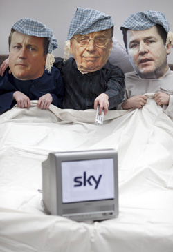 3月3日,抗議者在英國首都倫敦裝扮成英國首相卡梅倫(左)、新聞集團(tuán)董事長默多克(中)和英國副首相克萊格,以此反對新聞集團(tuán)收購天空電視臺。新華社/法新 |