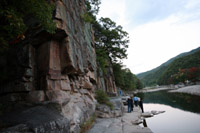 從最著名的章回碼頭上船,沿江而下,美麗的丹陽(yáng)八景就徐徐展現(xiàn)眼前。八景中最著名的,要屬“島潭三峰”,即聳立在呈“S”形彎曲的南漢江中心部位的三塊巖石。河流中心,三塊巖石按序排列,這一景致實(shí)屬罕見。有趣的是,這三塊巖石還各有名字,也有個(gè)故事呢。相傳,過去有對(duì)恩愛夫婦膝下無(wú)子,為了繁衍后代,丈夫娶了妾,但這個(gè)小妾一懷上孩子就虐待正室,弄得家里雞犬不寧。上天為了懲罰他們,就將三人都變成了石頭。因此,三峰中,以雄偉之姿立于中心的那塊高達(dá)6米的大巖石就是夫峰(又稱將軍峰),以優(yōu)雅模樣各據(jù)一邊的是妻峰(又稱兒峰)與妾峰(又稱女兒峰)。也有傳說(shuō)三峰原屬于江原道正善郡,有一次發(fā)大水,三峰山隨著水流流到南韓江,成為現(xiàn)今的島潭三峰。