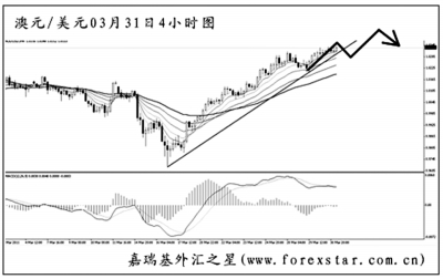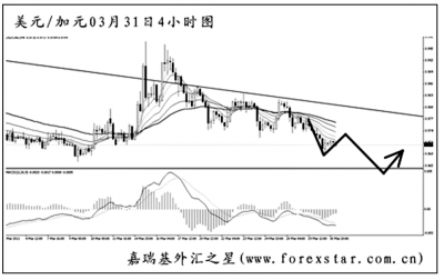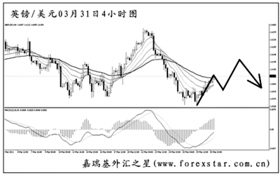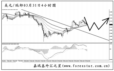 ▲美元兌瑞郎的反彈將4小時圖下降趨勢線突破,但從日線圖上看,均線系統(tǒng)的壓制作用仍然保持,同時道氏理論顯著高點的阻力在0.9370,升破后方可結束階段性的下跌。從圖中看,由于美元兌瑞郎此波反彈的力度有限,匯價仍然有向趨勢線發(fā)起回抽的風險。向上做多需謹慎。