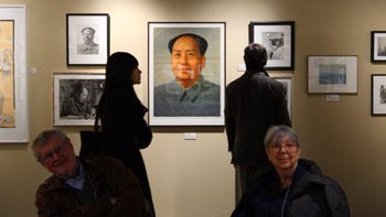 在展銷會(huì)上,除了來(lái)自中國(guó)的玉壺畫(huà)廊展銷呂厚明的“紅色經(jīng)典”、胡武功的“西北紀(jì)實(shí)”和姜一鳴的“當(dāng)代影像”外,還有來(lái)自華盛頓的伽里?愛(ài)德華茨(GaryEdwards)畫(huà)廊展銷由新華社陳石林大師制作的毛主席標(biāo)準(zhǔn)像。