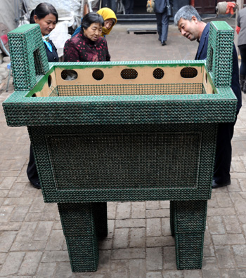 山西省左權(quán)縣72歲的收藏愛好者王艾甫用50余年收集來的古錢幣,制作成了一只高1.6米、寬1.2米的大鼎。這件名為“開元盛鼎”的作品由一萬八千余枚形式相同的“開元通寶”銅幣組成,耗時5年方制作完工,正準(zhǔn)備申報吉尼斯世界紀(jì)錄。王艾甫說,他希望把“開元盛鼎”作為建黨90周年的獻(xiàn)禮,祝福祖國繁榮昌盛。圖為參觀者在觀看“開元盛鼎”作品。
