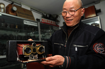 高繼生在收藏館內展示一臺立體式古董相機!∮浾摺↑S宗治/攝 |