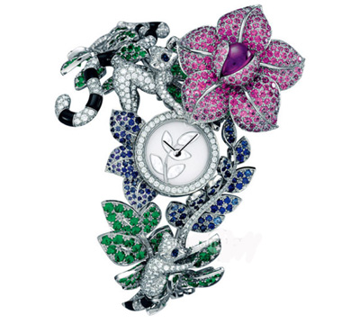 白金珠寶手鐲,鑲嵌鉆石、藍(lán)寶石、粉紅寶石及縞瑪瑙。白金鑲鉆表殼,珍珠母貝表盤。瑞士石英機(jī)芯。這款梵克雅寶Décor Makis高級珠寶表全球僅限量一只。