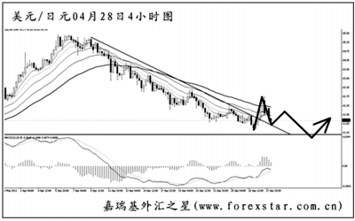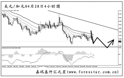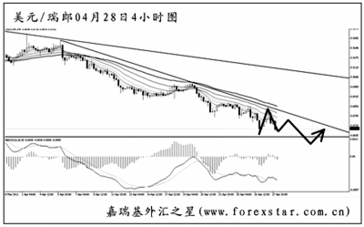 ▲美元兌瑞郎在跌破0.9635的支撐之后,下方已無任何可以阻擋住匯價下跌的點(diǎn)位。周線圖K線4連陰,下跌勢頭無比強(qiáng)勁。最近美元兌瑞郎的下降趨勢線不斷下調(diào),斜率逐次加大,雖然日線圖和4小時圖都發(fā)生了角度明顯的MACD底背離信號,但在有效突破壓力線和均線系統(tǒng)之前,仍需繼續(xù)看空。