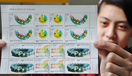 5月4日,一名集郵愛好者在展示她購買到的《深圳第26屆世界大學生夏季運動會》紀念郵票。當日,由中國郵政發(fā)行的《深圳第26屆世界大學生夏季運動會》紀念郵票在蘇州發(fā)行。該套紀念郵票一套4枚,內(nèi)容分別為“會徽”“吉祥物”“大運中心”和“主題口號”,全套郵票面值6.6元。