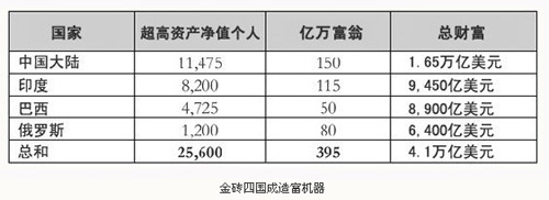 但全球范圍內(nèi)億萬富翁和有心成為億萬富翁的超富人口數(shù)量增長最快的,卻有可能是金磚四國,而不是美國或歐洲。