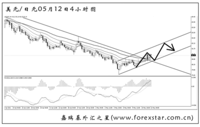 ▲美元兌日元的反彈已經(jīng)將4小時圖的下降趨勢線成功升破,目前形成了一個上升通道,匯價在通道內(nèi)緩步上行。圖中MACD處于多頭動能充盈的階段,道氏高點的阻力在81.20,若站穩(wěn)到此位置上方,匯價將沿通道進一步?jīng)_高。短線關(guān)注通道下沿的支撐作用,跌破才可進行做空交易。