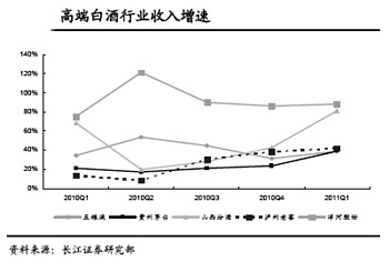 白酒行業(yè)、啤酒行業(yè)、葡萄酒行業(yè)、乳制品行業(yè)和其他食品飲料公司在2011年一季度保持了20%以上的收入增長,其中白酒行業(yè)收入增速提升至49%。食品飲料行業(yè)總體在2010年和2011年一季度收入高速增長,白酒行業(yè)在食品飲料細分行業(yè)中表現(xiàn)出了收入強勁增長的趨勢。從2011年一季報收入、成本、費用變化趨勢看,我們認為白酒行業(yè)仍然是2011年業(yè)績高增長的行業(yè)。