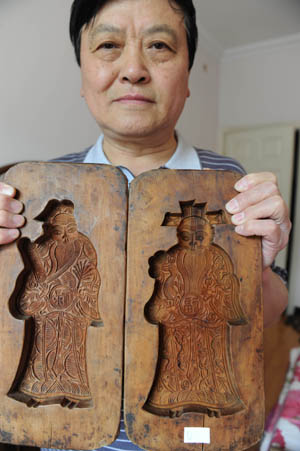 圖為衡水市民翟吉昌正在展示他收藏的一對“福祿”餅食模印!