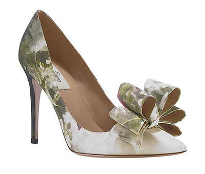 三層立體花朵蝴蝶結裝飾的Valentino高跟鞋,閃亮漆皮演繹濃郁的墨綠與優(yōu)雅的裸粉,盡顯時尚摩登氣質(zhì);印花緞面款則彰顯都會名伶的溫婉與精致。