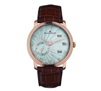 寶珀推出的Villeret兩地時年歷腕表,徹底顛覆過去的排列形式。所有日歷信息都顯示于表盤右側(cè),且以人們慣用的敘述順序布置,由上至下分別為星期、日期以及月份。