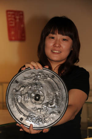圖為工作人員展示本次展品中最大的一面漢代銅鏡。