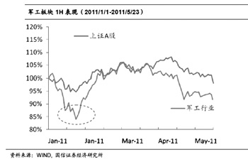 2011年5月份,軍工板塊依然維持弱勢格局,行業(yè)整體同步于大盤,目前軍工行業(yè)估值水平約為58倍。5月份統(tǒng)計的40只軍工板塊的股票超過半數(shù)走勢弱于大盤。我們認(rèn)為軍工行業(yè)依然處于成長期,具有國防和民用雙重成長空間,我們對行業(yè)持中長期看好觀點,但短期內(nèi)行業(yè)受市場整體估值水平下調(diào)影響依然有調(diào)整壓力,需要繼續(xù)等待調(diào)整后的買入機會。