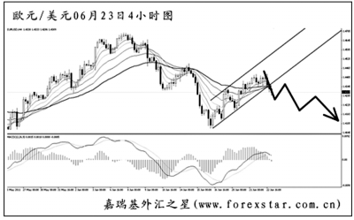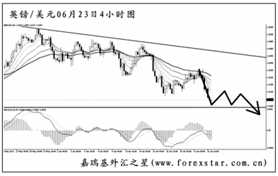 歐元兌美元小幅跌破了圖中的上升通道下沿,最近的下跌趨勢仍在延續(xù)。從日線圖上看,此輪歐元要挑戰(zhàn)的目標(biāo)仍然為5月下旬的低點1.3970,跌破方可打開進一步的下行空間。雖然圖中的均線系統(tǒng)被小幅升穿,但由于此前的反彈力度始終不強,預(yù)計后市歐元將以震蕩下行的走勢為主。