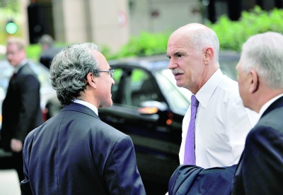 7月21日,在比利時(shí)首都布魯塞爾,希臘總理帕潘德里歐(中)抵達(dá)歐洲理事會(huì)大樓。當(dāng)日,歐元區(qū)特別峰會(huì)在布魯塞爾舉行。