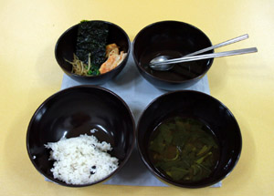 在沉默中,大家自取用來清潔餐具的清水、豌豆飯、腌菜湯和小菜。一切都有條不紊地按照順序進(jìn)行,連餐具的清潔都有特定步驟。小菜包括辣白菜、涼拌菠菜、沙參和豆腐,各取所需,量非常少。最重要的是,每個(gè)人必須拿一小塊酸蘿卜。大家沉默地吃完,再倒上鍋巴湯,用酸蘿卜塊仔細(xì)擦拭干凈每個(gè)碗,將其連湯帶水全部吃完,最后用手巾一一擦干,重新套好歸位。從吃飯到洗碗,一次全部完成,真是綠色、節(jié)儉又高效。缽盂供養(yǎng)教給大家不浪費(fèi)、自力更生的道理,是修行中不可或缺的一部分。
