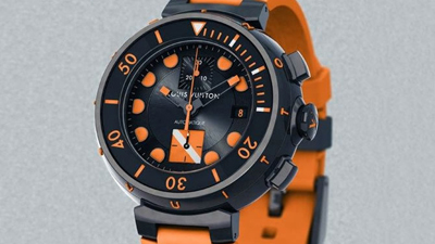 Vuitton橙色字樣,與表冠篆刻的LV標(biāo)志相應(yīng),大型夜光刻度單向旋轉(zhuǎn)表圈擁有潛泳時間顯示刻度,防眩水晶玻璃表鏡,黑色表盤,橙色半圓夜光大時標(biāo),6時位的小秒針以潛水旗為靈感,與橙色表帶設(shè)計完美呼應(yīng)。表背刻有“Only