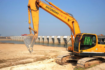 湘江長沙綜合樞紐右汊閘壩完成混凝土澆筑工程。7月28日,工程車輛在湘江長沙綜合樞紐工程施工現(xiàn)場作業(yè)。新華社記者 龍弘濤 攝 |