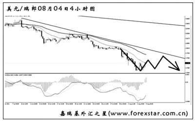 美元兌瑞郎繼續(xù)著連續(xù)創(chuàng)新低的走勢(shì)。由于瑞郎最近處于極端強(qiáng)勢(shì)的走勢(shì)中,且下方?jīng)]有任何有效支撐,短線匯價(jià)即使展開(kāi)一小波調(diào)整,但升破圖中下降趨勢(shì)線及均線系統(tǒng)的希望也不大,后市美元兌瑞郎仍將以沖高后繼續(xù)走低的趨勢(shì)為主。