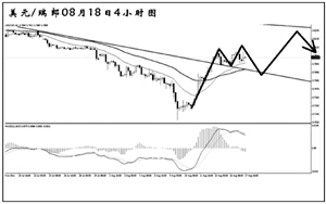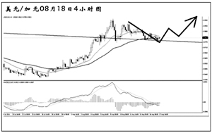 美元兌瑞郎在創(chuàng)出0.7070的低點之后強(qiáng)力反彈,接連升破了兩條下降壓力線的阻力,同時,4小時圖均線系統(tǒng)已經(jīng)形成多頭排列,瑞郎的強(qiáng)勢基本告一段落。目前匯價在對此前的上漲進(jìn)行修正,短線再度回抽趨勢線的希望較大,此后有望繼續(xù)上行,向周線圖趨勢線阻力0.8300一帶挺近。
